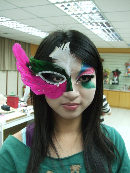 這個面具女孩的彩繪畫的很美,班上同學真的也太有材華了,應該請他們幫我定個妝讓我畫就好,自由發揮我會很抖啊‧‧‧‧‧