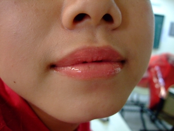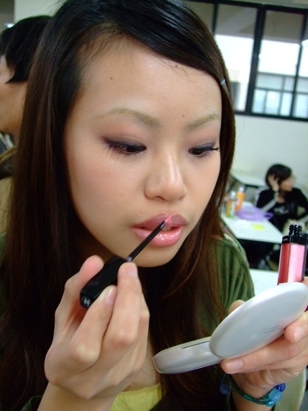 這是某女孩有一天問我有沒有唇蜜的時候,到我化妝包裡剛好有帶這隻#67 玫瑰糖霜色就讓她擦這一隻,剛好可以拍試色照了,班上有正妹同學的好處就在這邊,硬叫他擺個正在試擦的照片讓我側拍一下。