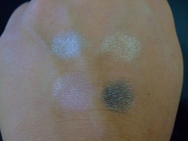 這一盤四色眼影的色號是#95 Sparkling Satins 應該是賣1850元還真不親民啊,只是比起香奈兒精品來講這個價錢又不算甚麼了,看試色圖可以發現其實主要是以光澤色為主,從銀色、金膚色、亮粉紅色、灰黑色都是比較透明的發色度,就灰黑色比較有顏色的感覺,剩下的都是很閃亮的光澤感,但我還是用了同一盤化了兩種眼妝唷。