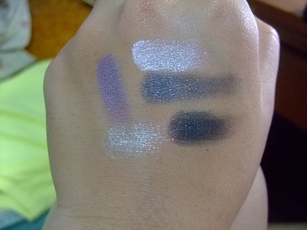 手背的試色照片,看得出來就是有紫色、白色、灰色、銀黑色、小星星色,我覺得這一盒顯色度很棒,但粉末我覺得太柔軟了,尤其是白色跟紫色的,只要輕輕一沾就有顏色了,用眼影刷會有一點飛粉唷,不過五色都超顯色也都滿閃的,所以其實就是搭配性比較高,不會說眼影盒裡面顏色差異不大,一定要全上色才有眼妝的感覺。
