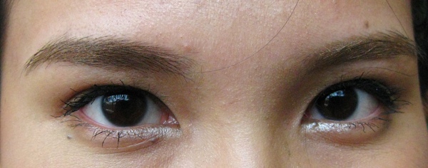 眼線先用筆匠黑色眼線膠填滿根部後,再用細眼影刷沾BB眼影盤的Caviar深黑棕色疊上去,最後再使用MJ黑色眼線液化最後的定型啊,這樣眼線一定不會再掉了吧。