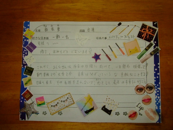 這學期就是我的語言學校修業的時候了,要做一本類似畢業冊的東西,但也不過是黑白影印的,老師發給大家一張紙就可以亂寫一些話,做一些美編,當然我不想花錢買貼紙,所以就從化妝品的目錄裡來剪剪貼貼,好久沒作美勞了,好像有一點點興趣了。