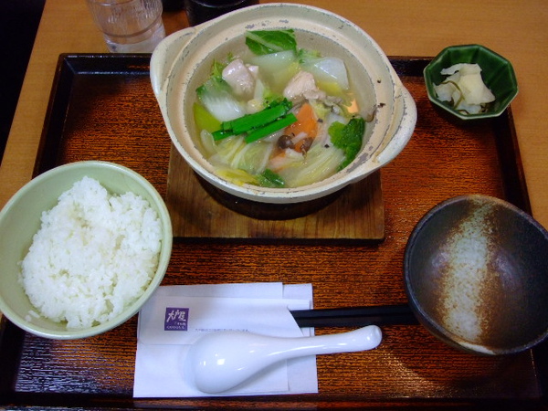 這個我也會做,隨便拿一個湯包加上白菜跟菇、放些蔥跟少許的四小塊肌肉煮熟就完成了,早知道就乖乖的點豬排飯就好了