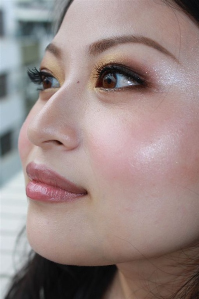 完妝效果很自然,完全就是像從肌膚裡透出來的一樣,畫完腮紅也可以再用打亮色的亮采棒隨意的點在肌膚上推開唷,我還加強了眉骨,看起來肌膚是滋潤的光澤感呢。