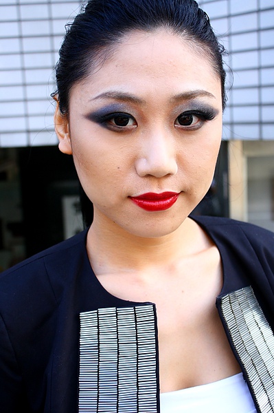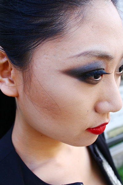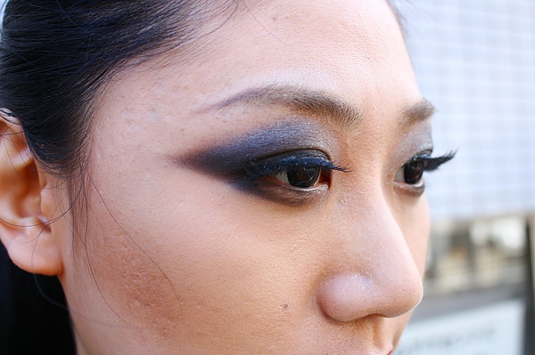 眼妝跟前天的方向大概差不多,但有化的更精細一點還有角度跟比例都有細看過,同樣用KATE的BR色眼影凍打底,這次在眉頭下方有加強更深一點點,也是使用BB的裸采風華眼影盤中的深棕黑色直接化拉長眼妝,化之前也是用了大量的塞尚白色霧面粉放在下眼部,預防眼影掉落後擦不掉的窘況,這次的深色部份依照模特兒要求有更高一點,看來真的不是想輸人呢,在眼窩部份是NARS的GALAPAGOS做暈染,只是後來韓國女說他討厭那個棕色,我意思意思沾了點NYX的灰色眼影疊上去這樣,一樣是很濃的妝,看來韓國妹也不知道該說什麼了。